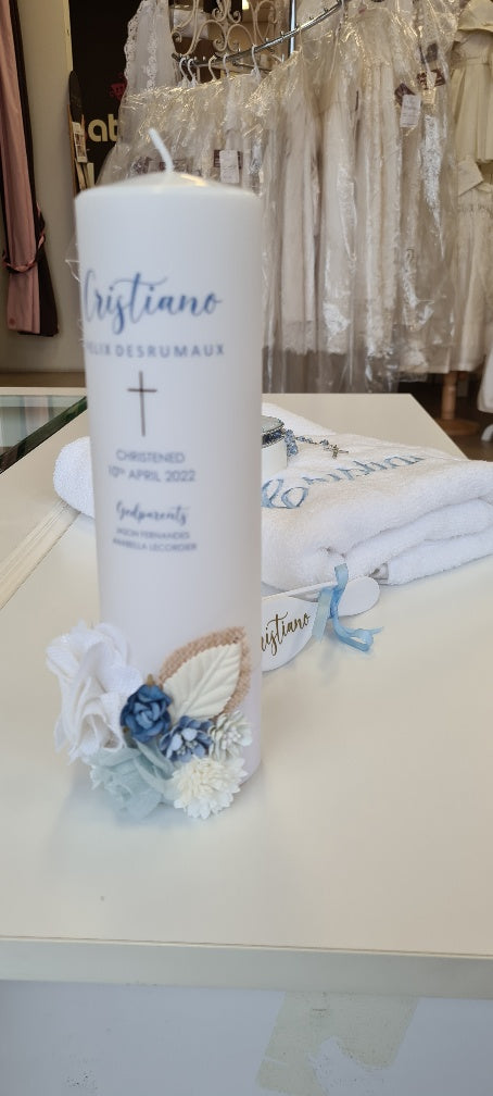 Text printed on a transparent matte wrap and attached to candle. Other details can be added also (eg. godparent names, church name etc). Colouring (flowers, ribbons or printing) can be changed to match your theme - please advise changes in Notes when checking out.