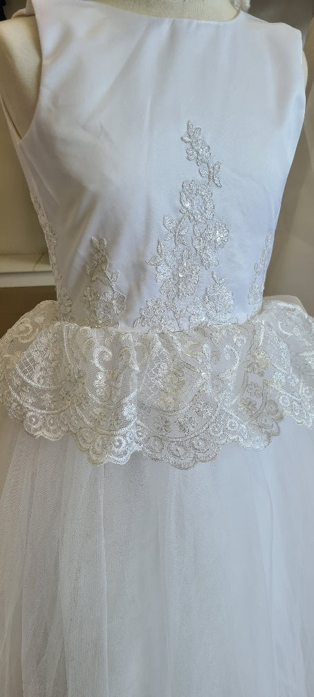 Gorgeous white communion gown with satin top & lace feature, lace panel at bodice and continuing under waistline with an elegant frill at waist and soft layers of tulle and satin continuing down.