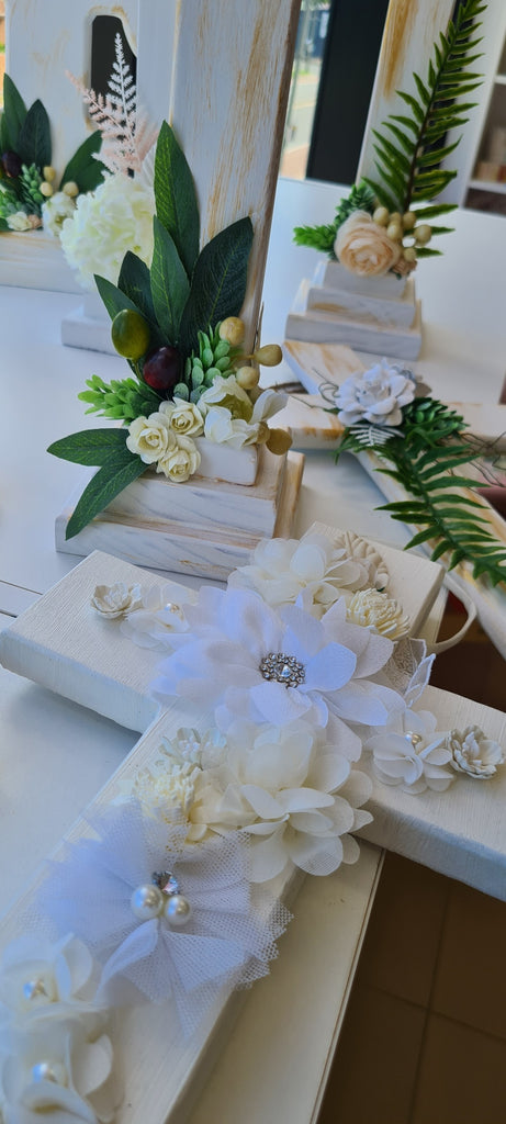 Beautiful, elegant 30cmH painted wooden hanging cross with white floral decoration.