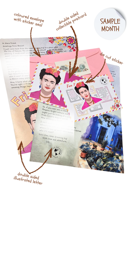 ✨ Every month they'll receive - a double sided letter, collectible card and a sticker